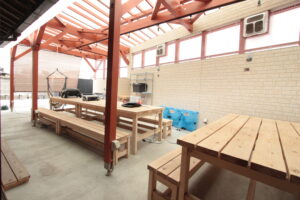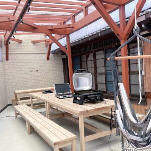 庭部分には、みんなでにBBQを楽しめるスペースです。屋根付ですので雨天時でも可能です。バーベキュー器具も備付きのWeber Pulse 1000、などが標準で装備されています。調理器具、お皿、箸付き。